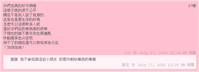 店家在該部落格上留言, 揚言提告